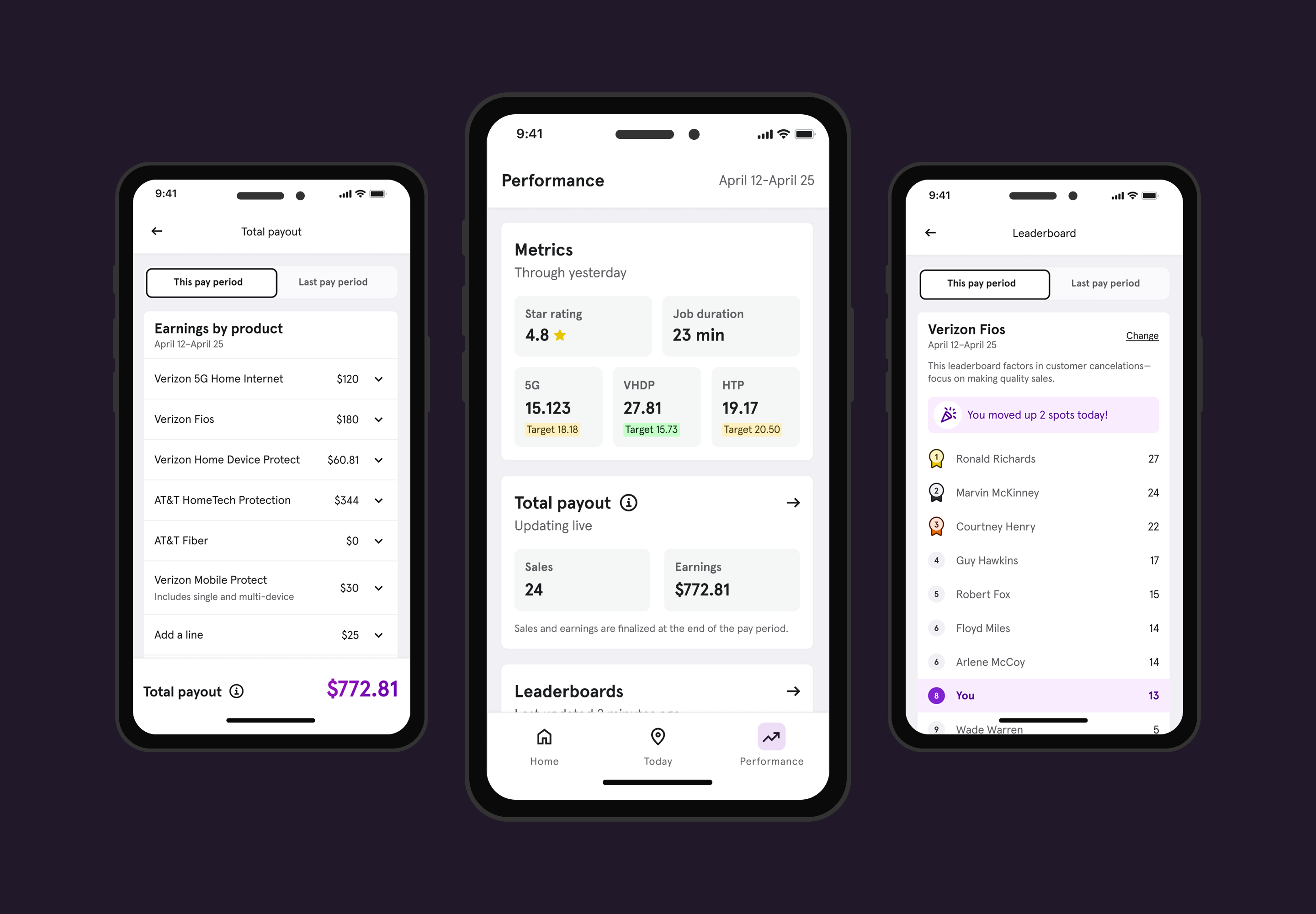 I led the definition of a new IA model using what we had learned from our research, as well as leveraging common patterns out in the wild. We introduced a bottom navigation with three primary destinations: a Homepage, the Job Feed, and a dedicated Performance Dashboard.